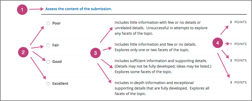 Options. Each criterion has a set of options, usually a range of ratings, which describe how well each response satisfies the criterion. For example a set of options might be “Fair”, “Good”, or “Excellent”.