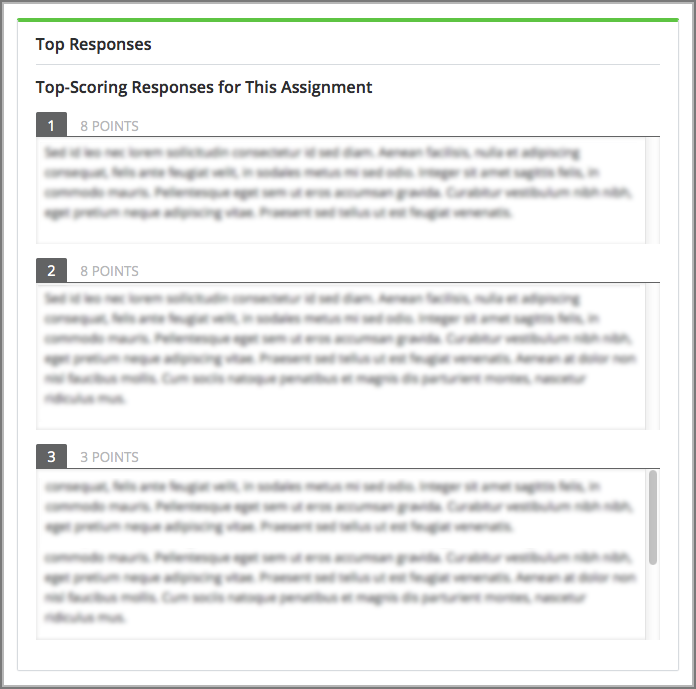 You can include a Top Responses section that shows the top scoring responses that learners have submitted for the assignment, along with the scores for those responses. The Top Responses section appears below the learner’s score information after the learner finishes every step in the assignment.