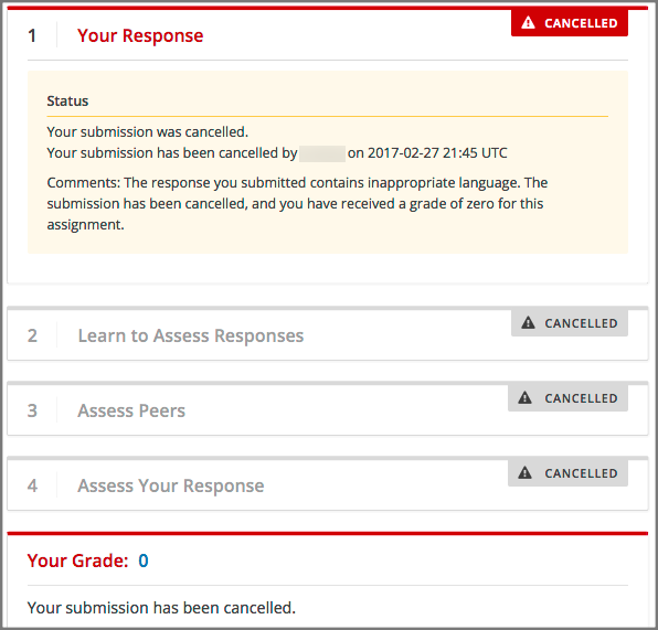 When the learner views the assignment in the course, she sees that all steps in the assignment have a status of “Cancelled”. Under Your Response, instead of the text of their response, she sees the date and time that their response was cancelled, and the comments relating to the removal of their submission.