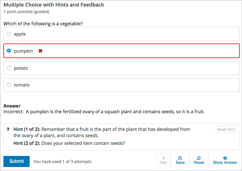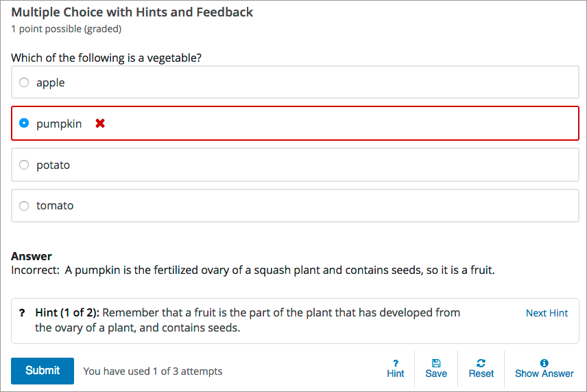 For example, the following single select problem provides feedback in response to the selected option when the learner selects Submit. In this case, feedback is given for an incorrect answer.